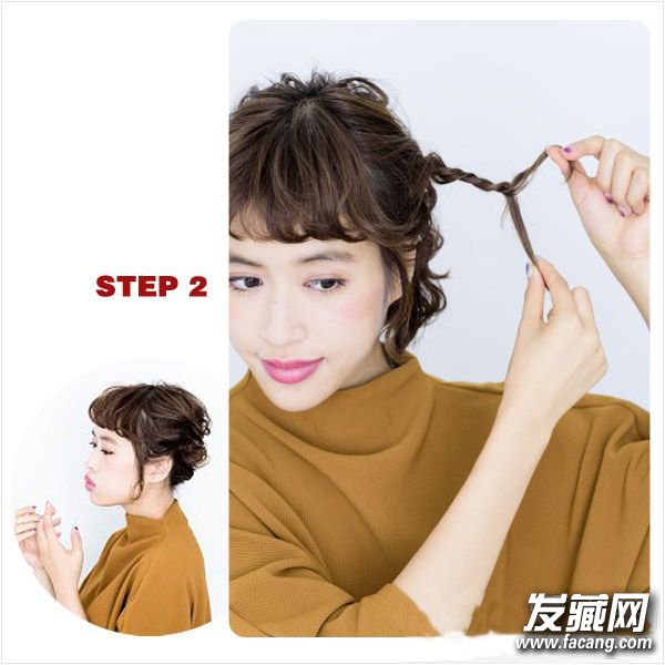 接着取耳朵旁边的头发分成两半不停交互扭转并往后靠近半马尾。