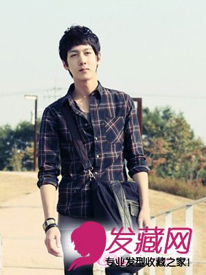 大学生们挚爱的一款男士短发发型图片,圆弧形的发型设计让头部看上去饱满圆润,发质软的男生大可采用哦!圆弧形裁剪出来的齐刘海与经过烫发之后的蓬松感,不单单只是帅气,还能够刻画出他精美的脸部轮廓,搭配格纹衫,休闲帅气