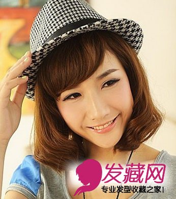 一款短发梨花头发型展现小女人的优雅甜美气质,内卷发尾的梨花头发型,十分的俏丽可爱,3/7分斜刘海的发型设计,呈现出女生精致可人的脸蛋,搭配一定格子的爵士帽,尽显时尚潮流。