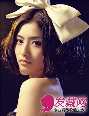 中分的蓬松波波头短发,一款非常时尚的短发造型。中分的短发梨花烫,发尾蓬松的烫发感觉,加上夸张的大蝴蝶结发饰,很有艺术照的风格。