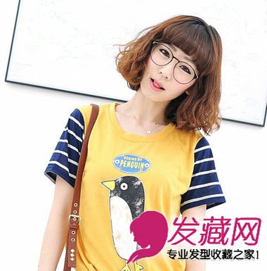 韩系齐刘海挑染棕色微烫短发,蓬松的烫卷韩味十足,搭配眼镜,很学院风哦