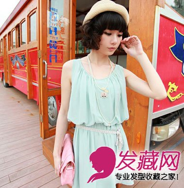甜美的齐刘海短卷发,蓬松丰盈的发卷搭配米白色编织帽,水蓝色雪纺裙,仙气可爱