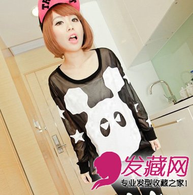 小麦色内扣斜刘海波波头短发发型,搭配粉色棒球帽,荧光星星罩衫可爱搞怪