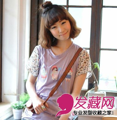 俏皮可爱的韩式齐刘海挑染色烫发发型,发顶扎个发髻丰富发型,可爱萌系