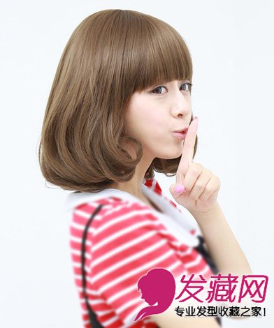 齐刘海的短发梨花头发型,在中短发的发型上,加入梨花烫的烫发元素是非常流行的。亚麻色的染发,更显时尚哦。