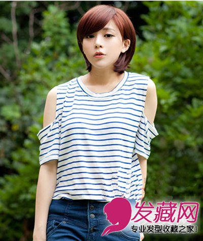 完美剪裁的斜刘海波波头造型,两侧头发别于耳后露出精致小脸,搭配露肩海军风条纹T和牛仔裤,青春感扑面而来。