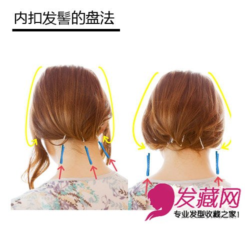 step3:松开头顶的头发,发尾部分塞进内扣,在四周用黑色小发夹一一固定。