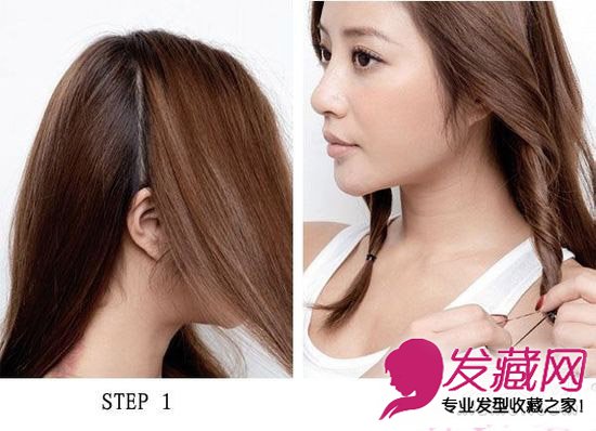 step2.前额右边的刘海顺时针拧转固定。剩下左边的头发同样拧转固定。