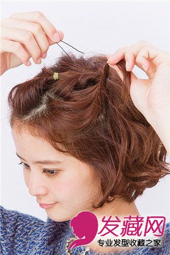 6、侧边头发也松散的蓬松拧转,用发夹固定。