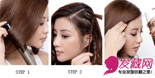 step1.将头发做自然偏分,右侧用中号的卷发棒从发尾处开始往里向上卷卷儿,轻轻地一点即可,打造出很自然的卷度。