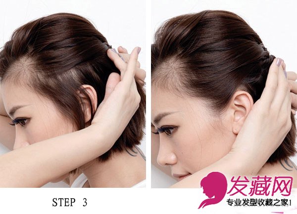 step3.左侧耳朵上方的头发尽量向脑后拉紧固定。紧挨上耳处留出一小绺头发。