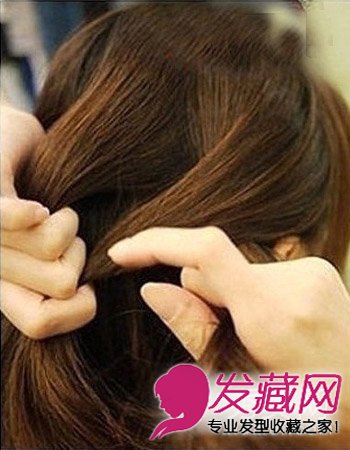 从刚刚拢至耳朵后面的头发顶处挑取一大束头发,从耳朵上方开始按照三股辫的编法进行编发。