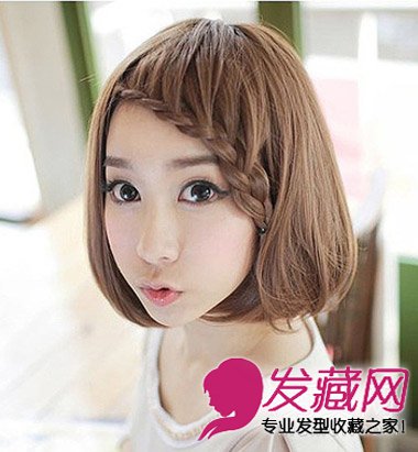 这款可爱的波波头造型,刘海处的麻花辫编发是一大亮点,侧编发的形式搭配蓬松的发丝完美的修饰了女生的鹅蛋脸。