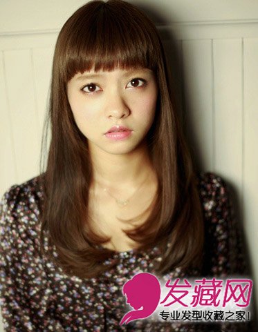 巧克力色的时尚发型颜色,微卷的弧度的发丝,刘海齐平而发尾稍微有点不齐的层次剪法,使得发型看起来不会那么“死”的感觉。眼下的向内的发丝也能修饰脸型,适合任何脸型的MM