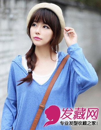 很小清新的一款女生侧边扎发发型,一般的侧边扎发都会给人们优雅感,但这款扎发给人的最多的却是甜美与清新感,整齐的刘海造型与一顶帽子的搭配更显清新的田园风。