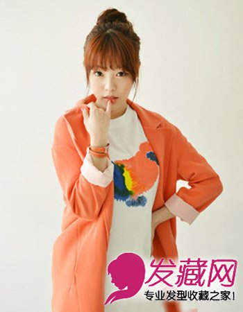 一款高扎的花苞头发型,配合整齐的空气感刘海造型与时尚的发色在修颜的同时还显女生的清新与可爱感,在这种初秋季节值得一试哦。
