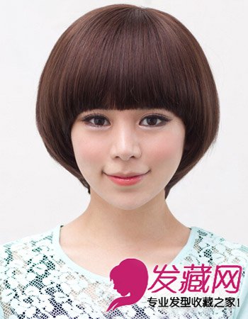 一款女生蘑菇头发型设计,搭配厚重的齐刘海造型,再加上两鬓的发丝紧贴脸颊,很好的修饰脸型,是一款上非常修颜的女生短发。