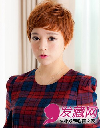 金棕色的发丝颜色,搭配蓬松的气质短发,打造一款韩味十足的女生发型,再加上斜刘海的修饰,完美展现一张精致的小脸。