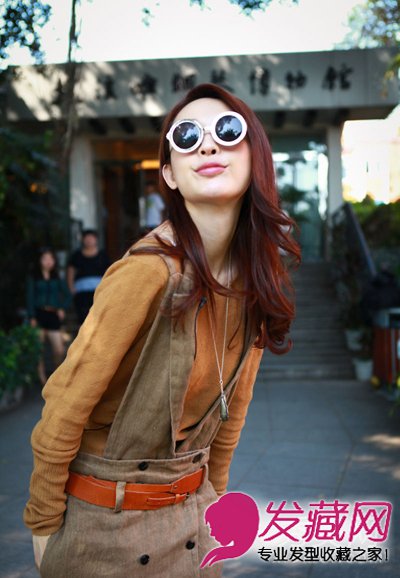 非常优雅帅气的一卷长卷发,酒红是发色,看起来时髦有型,搭配复古圆框眼镜,更加俏皮活泼。