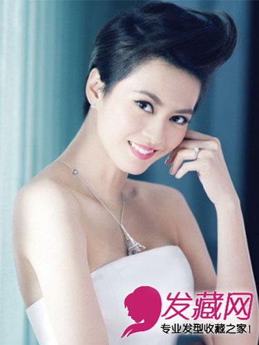 这款飞机头短发造型看起来很清爽。烫弯的长刘海梳到头顶,黑色短发光泽亮丽,笑容满脸,洋溢着幸福感。
