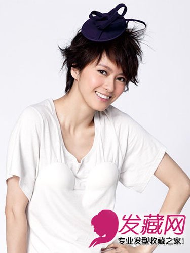 三七分刘海,发丝刻意制造凌乱感,蓬松短发加上小巧帽子打造俏皮可爱形象。