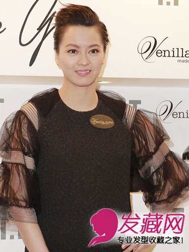 将刘海全部梳到头顶,利用摩丝梳出纹理,两边短发也往后梳,加棕色染发,体现梁咏琪个性帅气魅力。
