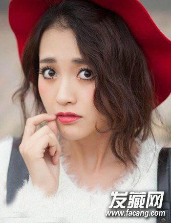 超卡哇伊的日系卷发,也是女生修颜显嫩的法宝,蓬蓬的小玉米烫在脑后松松的绑起来,戴上红色小礼帽,斜分的厚重卷发刘海更是起到很好的修颜点缀效果,凸显大眼萌妹范。