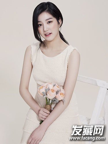 三七分长发造型,将黑色长发简单扎到脑后,一边长刘海垂下,另一边挽到耳后,体现端庄和典雅的气质。