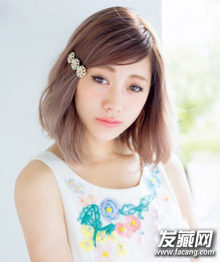 栗色波波头打造出清新甜美的气质感,斜刘海沿着脸颊摆动起来,用发饰固定后更显甜美迷人。