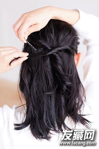 2,右太阳穴上方的头发也一样朝后脑勺拧去,和第1步的头发交叉后用发针固定。