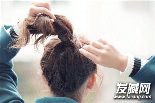 用手指穿插梳理头发,切忌不能过于光滑整齐。在脑勺高处聚拢后,用皮筋加以固定。