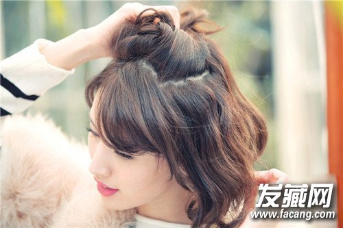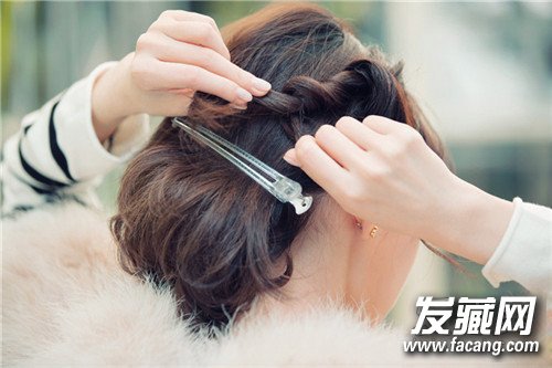 将刘海后2CM宽的头发以6/4的比例分区,较少部分头发分成两束相互缠绕并在耳后固定。