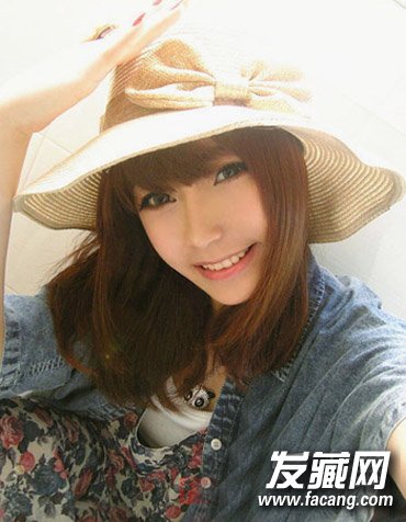 柔顺的中短发发型,斜碎刘海清新甜美,戴 上帽子不仅甜美而且有个性,显露出女生的可爱与活泼感。