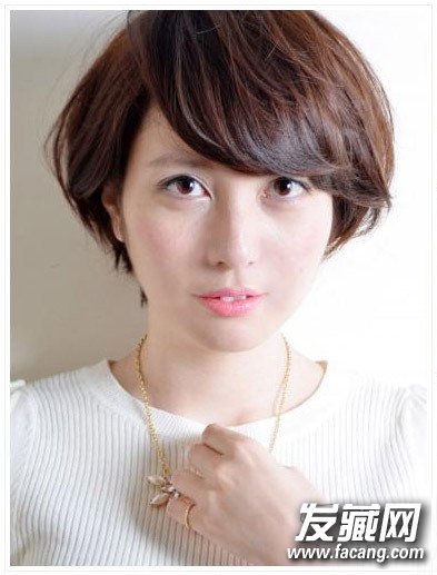 发型点评:这款短发采用了圆润型设计感,蓬松的造型将头型也修饰得饱满十足。斜刘海略带飘逸色彩,卷翘的弧度个性十足。
