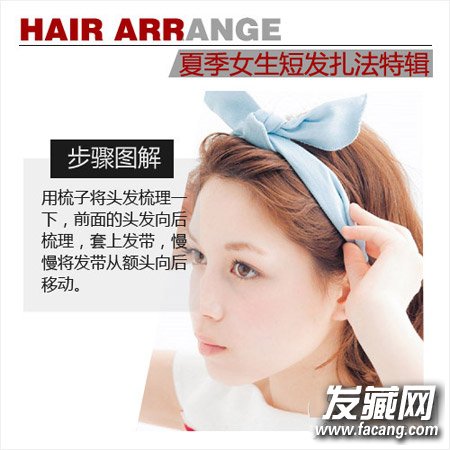 step 1:用梳子将头发梳理一下,前面的头发向后梳理,套上发带,慢慢将发带从额头向后移动。