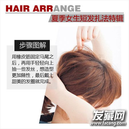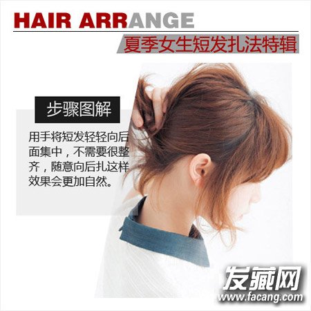 step 1:用手将短发轻轻向后面集中,不需要很整齐,随意向后扎这样效果会更加自然。