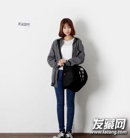 齐刘海内扣式发尾,韩味十足。高腰直筒裤是韩搭的定番款。