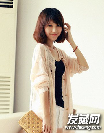 对于国字脸型的mm来说,千万不要完全把整张脸暴露出来,选择带点甜美感齐刘海短发,配上时尚发色,是不是乖巧看很多。