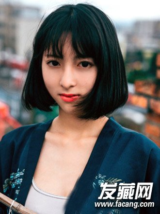 这款甜美的齐刘海波波头短发也是很有显瘦显高效果的俏皮短发造型,乌黑发型莹亮,内扣发尾配合打薄的飘逸感发丝更显轻盈。
