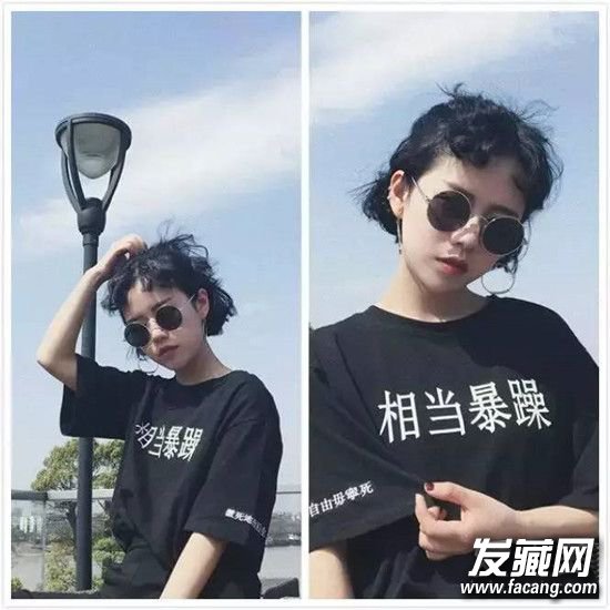 这样看起来给人炫酷和小太妹的感觉哦!有点小可爱的蛋卷烫头,中分刘海也烫成了蛋卷,看起来很个性哦。再戴上个性的圆框墨镜又有种很时尚的感觉呢,此款发型适合学生妹和嘻哈风格~