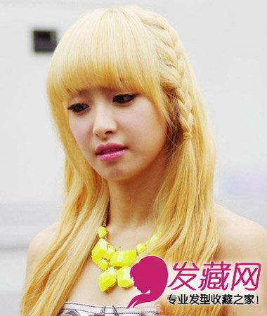 很多MM都喜欢宋茜MM的这款亮眼的韩式发型,浅浅的鹅黄色染发最衬白嫩肤色,搭配齐刘海修颜甜美,侧边辫子编发更添清甜少女气息。