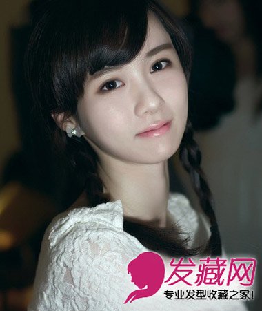 小清新范儿斜刘海造型,中长的乌黑发丝编两根可爱的小辫子,清新又淑女范儿,森女们的必修方脸发型。