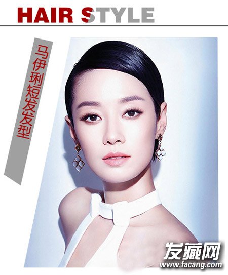 一九分的斜刘海稍微修饰脸型,用发胶发蜡将全部发丝紧贴头皮,打造出潮流复古的效果。本款发型虽然将马伊琍的方脸全部显现出来但显脸小,反而凸显出时尚感。