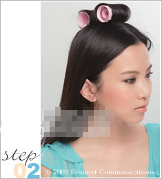 step2. 从顶部提取两片发片, 分别卷入发杠并静置数分钟, 为顶部提升适当的发量感。 发杠要前后并排卷入, 以免影响整体轮廓。