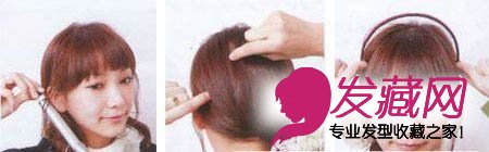 用电卷发 棒把发尾卷成中度卷发,然后扎成低位侧面马尾,再圈上发箍,用手拽下发顶的位置,让其呈现膨松弧度即可。