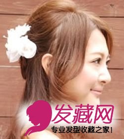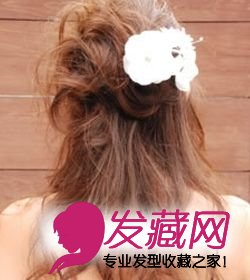 提取最外层的整体发片,扎成一股发束,松松地绕一圈。作为点缀,用白色山茶花点缀在旁侧。