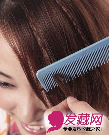 步骤1在刘海 处随意挑几绺头发编成麻花辫,用梳子倒梳刮蓬发尾让辫子定型。
