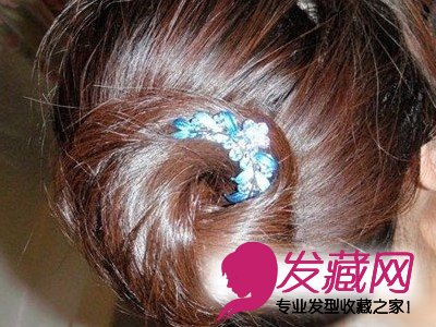 第三步,发尾都绕好后,把发尖部分藏好到缠绕的部分里面去,这个藏发尖的程序也可以等簪子插进去以后做。记的绕紧一点。看这个时候就是左手食指在头发里面,其它手指都在外面了。