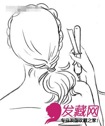 4、将其余头发用皮筋扎紧固定在头发右侧。用电卷棒夹卷发 尾。