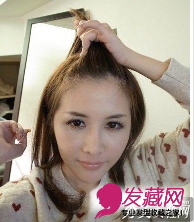 2、将前额刘海 往上抓出一个发束